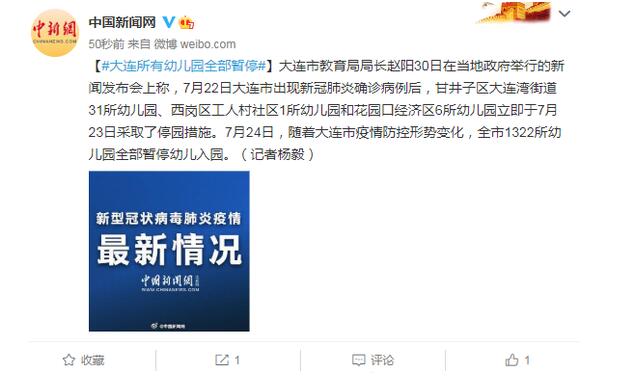 7月30日上午,大連市召開疫情防控新聞發(fā)布會。大連市教育局局長趙陽通報:7月22日大連市出現(xiàn)了新冠肺炎確診病例后,甘井子區(qū)等31所幼兒園,西崗區(qū)工人村社區(qū)的1所幼兒園,花園口經(jīng)濟區(qū)6所幼兒園,于7月23日即采取了停園的措施。7月24日隨著大連市疫情防控形勢的變化,全市1322所幼兒園全部暫停幼兒入園。