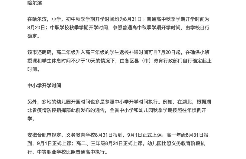 暑假倒計時開始,對于今年秋季開學(xué)全國各地已經(jīng)開始規(guī)劃,親貝網(wǎng)小編今日了解到,已經(jīng)有多地確定新學(xué)期開學(xué)日期,月初安徽已有高校迎來了首批返校本科生,北京部分高校將返校時間定在8月底至9月初,上海、湖北等地也公布了中小學(xué)及幼兒園開學(xué)安排,快跟著親貝網(wǎng)小編一起來看看。
