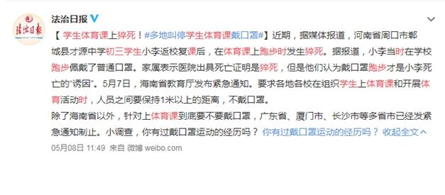近期,據(jù)媒體報(bào)道,河南省周口市鄲城縣才源中學(xué)初三學(xué)生小李返校復(fù)課后,在體育課上跑步時(shí)發(fā)生猝死。據(jù)報(bào)道,小李當(dāng)時(shí)在學(xué)校跑步佩戴了普通口罩。家屬表示醫(yī)院出具死亡證明是猝死,但是他們認(rèn)為戴口罩跑步才是小李死亡的“誘因”。5月7日,海南省教育廳發(fā)布緊急通知。要求各地各校在組織學(xué)生上體育課和開(kāi)展體育活動(dòng)時(shí),人員之間要保持1米以上的距離,不戴口罩。