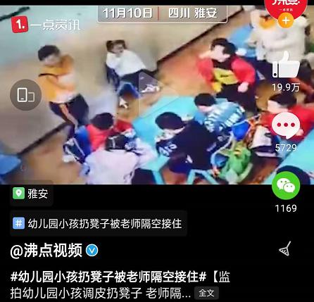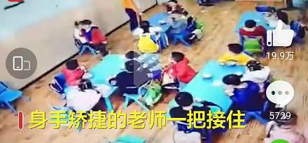 幼兒園孩子調(diào)皮扔凳子,被老師隔空接住