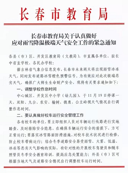 長春暴雪將至 家長收到學(xué)校停課通知