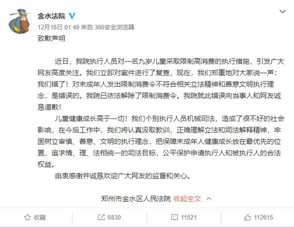 在網(wǎng)友的強烈追問下,河南法院最終向大眾道歉,本著公平公正公開的原則,為創(chuàng)造更加和諧健康的社會環(huán)境,全面保護未成年人應(yīng)有權(quán)益,河南法院最終取消了女孩兒的限制消費令。