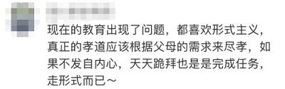 有網(wǎng)友認為,這一套形式太過形式主義,感恩父母無可厚非,但跪拜太封建,以傳統(tǒng)的名義教育學生跪拜,是在灌輸過氣觀念;
