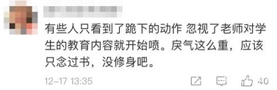 還有網(wǎng)友認為,有些人只看到跪下的動作,忽視了老師對學生的教育,這個老師在收到家長反饋的第二天就處理此事,值得點贊。
