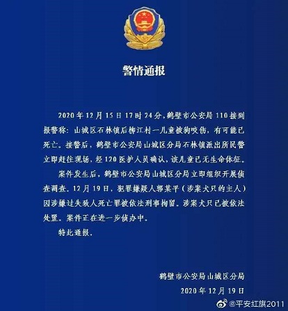 12月20日,鶴壁市公安局山城分局發(fā)布通報稱,狗的主人郭某平因涉嫌過失致人死亡罪被依法刑事拘留。