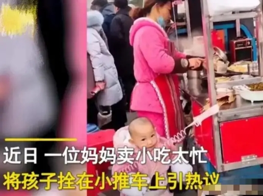 視頻中,一位年輕的媽媽正在街邊的小吃攤點(diǎn)忙碌著,而身邊,是她只有18個(gè)月大的寶寶。寶寶身上穿著厚厚的棉服,手里拿著幾串小吃,一個(gè)人乖乖的在玩,完全沒(méi)有去打擾忙碌的媽媽。