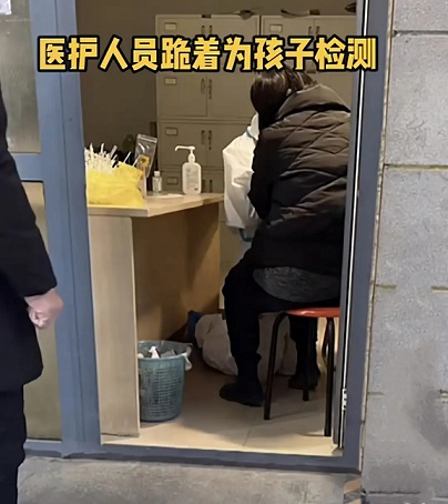而近日一張醫(yī)護(hù)人員跪著為孩子檢測的畫面也讓很多人淚目。