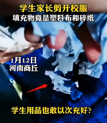 河南商丘一學(xué)校校服里竟然只填充了塑料布和紙,黑心校服再惹爭(zhēng)議