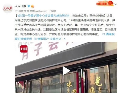 近日,網(wǎng)曝遼寧沈陽鑫享悅時光母嬰護理中心內(nèi),14名新生兒感染病毒性肺炎入院。