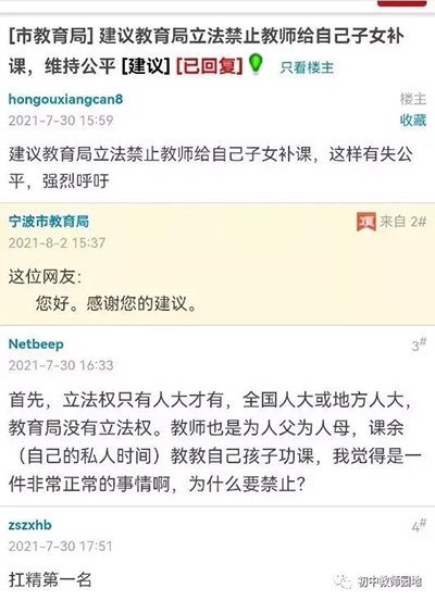 教育局看到這條留言后,恢復(fù)讓人直呼過癮:這位網(wǎng)友您好,感謝您的建議。首先,立法權(quán)只有人大才有,全國人大或地方人大,教育局沒有立法權(quán)。教師也是為人父為人母,課余(自己的私人時間)教教自己孩子功課,我覺得是一件非常正常的事情啊,為什么要禁止?