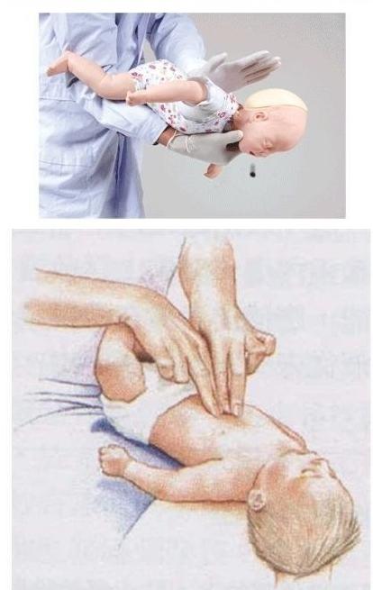 當孩子發(fā)生卡喉嚨時,救護人應立馬把孩子抱起來,一只手捏住孩子顴骨兩側,手臂貼著孩子的前胸,另一只手托住孩子后頸部,讓其臉朝下,趴在救護人膝蓋上。在孩子背上拍1-5次,并觀察孩子是否將異物吐出。如果上述操作異物沒出來,可以采取另外一個姿勢。把孩子翻過來,躺在堅硬的地面或床板上,搶救者跪下或立于其足側,或取坐位,并使患兒騎在搶救者的大腿上,面朝前。搶救者以兩手的中指或食指,放在患兒胸廓下和臍上的腹部,快速向上重擊壓迫,但要很輕柔。重復,直至異物排出。
