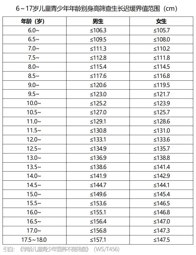 生長(zhǎng)遲緩定義為:由于膳食的蛋白質(zhì)或能量、維生素、礦物質(zhì)攝入不足等原因,導(dǎo)致身高低于篩查標(biāo)準(zhǔn)的年齡別身高界值范圍,屬長(zhǎng)期性營(yíng)養(yǎng)不良。