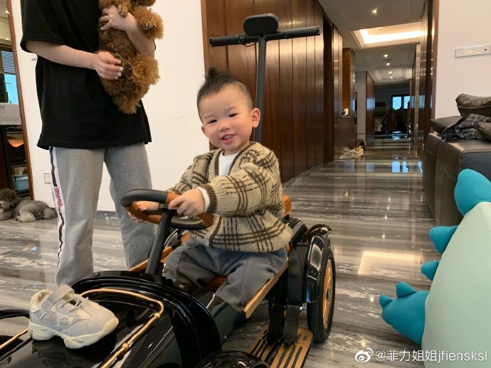 1月16日,“網紅”雪梨在微博上曬出一組兒子坐在玩具車里和狗狗“握手”的照片,十分可愛。