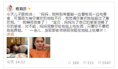 3月15日,程莉莎在微博曬出丈夫郭曉東和兒子的近照,并分享了一家人的日常。她發(fā)文寫道兒子很想一邊看電視一邊吃零食,但因?yàn)閮鹤诱J(rèn)為媽媽很喜歡地毯,而且媽媽喜歡地毯勝過喜歡自己,所以便不敢這樣做。程莉莎聽到后深感自責(zé),并向兒子說道:“寶貝,媽媽為了自己的感受忽略了你的感受,對(duì)不起,媽媽同意你在地毯上吃東西,只要你不要把地毯弄臟。”隨后便發(fā)現(xiàn),丈夫郭曉東明目張膽地在地毯上吃起了薯片。而程莉莎見狀立刻毛躁了起來,郭曉東則順勢調(diào)侃道:“我覺得你心疼地毯超過了心疼我!”