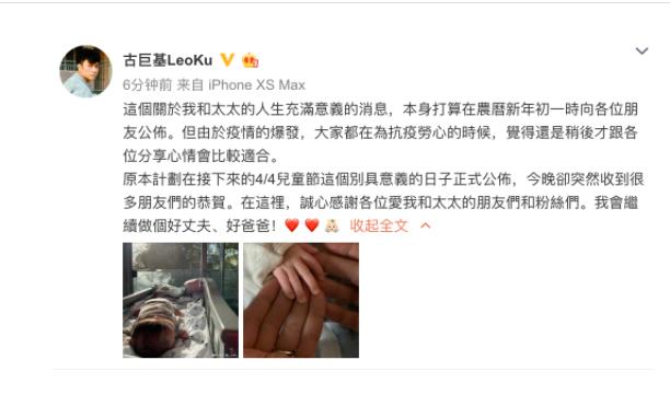 3月15日,古巨基通過(guò)微博宣布已升級(jí)當(dāng)爸爸。他寫(xiě)道:“這個(gè)關(guān)于我和太太的人生充滿意義的消息,本身打算在農(nóng)歷新年初一時(shí)向各位朋友公布。但由于疫情的爆發(fā),大家都在為抗疫勞心的時(shí)候,覺(jué)得還是稍后才跟各位分享心情會(huì)比較適合。原本計(jì)劃在接下來(lái)的4/4兒童節(jié)這個(gè)別具意義的日子正式公布,今晚卻突然收到很多朋友們的恭賀。在這里,誠(chéng)心感謝各位愛(ài)我和太太的朋友們和粉絲們。我會(huì)繼續(xù)做個(gè)好丈夫、好爸爸!”同時(shí),他還曬出了一家三口手放在一起的照片,小寶貝的側(cè)顏也