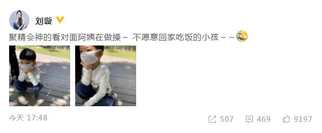 5月13日,劉璇在微博曬出兒子的萌照,并配文:“聚精會神的看對面阿姨在做操~不愿意回家吃飯的小孩~” 照片中劉璇的兒子留著鍋蓋兒西瓜頭,戴著口罩蹲在地上,兩手托腮,認真地看著阿姨們做操,畫面呆萌十足。