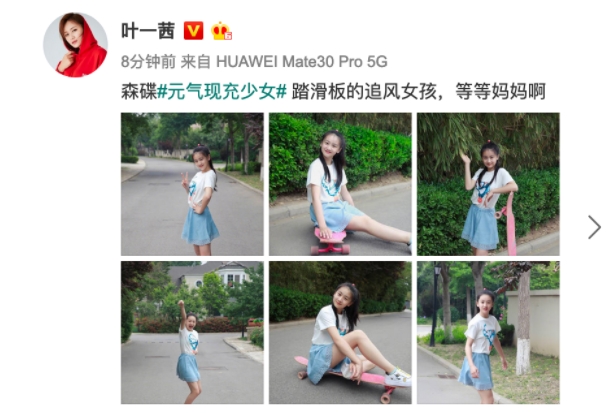 5月18日,葉一茜在微博分享女兒森碟玩滑板的近照,并配文:“踏滑板的追風(fēng)女孩,等等媽媽啊”。照片中的森碟身穿白色短袖搭配淺藍(lán)短裙,雙腿白皙勻稱,她站在滑板上,對鏡做出“沖呀”的手勢,元?dú)馐恪?/p>