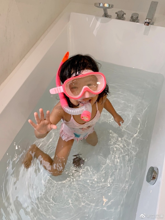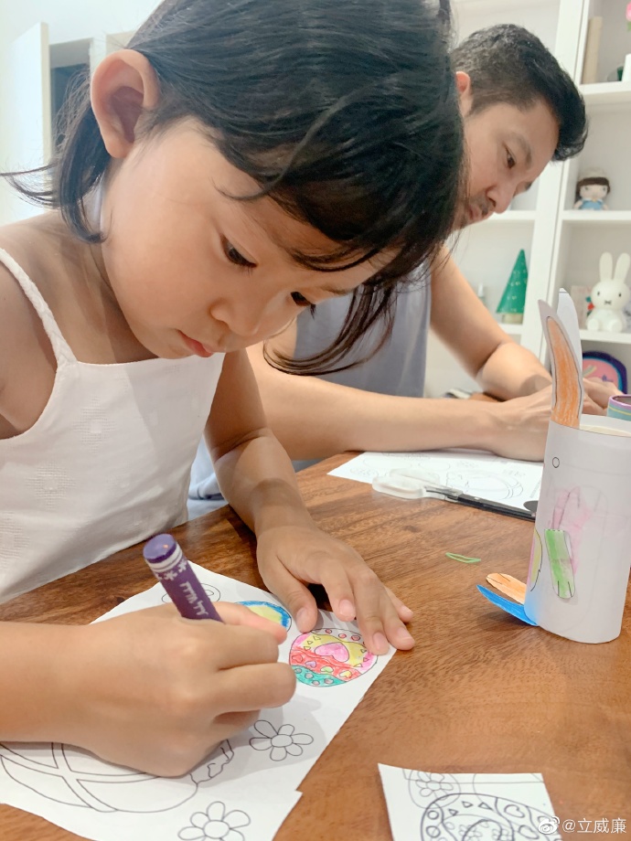 5月18日,立威廉在微博上曬出一組女兒在家里的生活照,配文:“在家待了六個禮拜了!這是我們最近在家里的活動!”照片中,小姑娘跳舞、烘焙、畫畫、游泳,不亦樂乎。立威廉陪伴在旁邊,盡顯父愛。