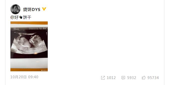 10月20日,相聲演員燒餅在微博曬出一張妻子的B超檢查照片,并配文:“你好,餅干”,宣布懷二胎喜訊,同時透露了寶寶小名。照片中清晰可見寶寶的形態(tài)乖巧的躺在媽媽肚子里。粉絲紛紛發(fā)來祝福:“期待小餅干的到來啊!”“恭喜啊啊啊!”