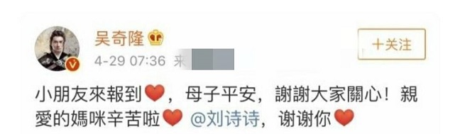 2018年12月,吳奇隆公布劉詩詩已懷孕的喜訊,2019年4月29日,吳奇隆發(fā)文慶祝小寶寶的到來,"母子平安,謝謝大家的關(guān)心,親愛的媽咪辛苦啦!@劉詩詩,謝謝你。"他們給兒子取名步步,網(wǎng)友猜測可能是借鑒了《步步驚心》。