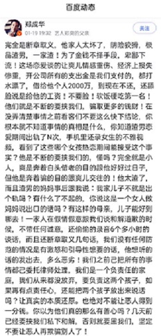 不過鄭爽一方也對這次事件進行了反駁,鄭爽父親微博發(fā)聲,說張恒一家人太壞了,騙感情騙錢,“軟飯硬吃第一名”,他說這6段語音是張恒偷偷錄下的,斷章取義,讓大家千萬不要相信他。