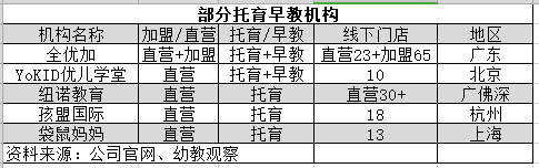 目前的市場(chǎng)各玩家仍處于小而分散的分布。對(duì)于托育機(jī)構(gòu),多數(shù)以直營(yíng)或直營(yíng)+加盟模式、師資培訓(xùn)、社區(qū)型的模式存在。如紐諾教育、全優(yōu)加、YoKID優(yōu)兒學(xué)堂、孩盟國(guó)際、袋鼠麻麻、壹號(hào)貝貝等。