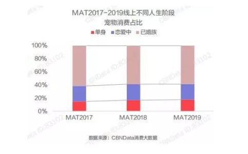 近三年,單身及戀愛人士線上寵物消費(fèi)占比提升,已婚族養(yǎng)寵熱情下降。