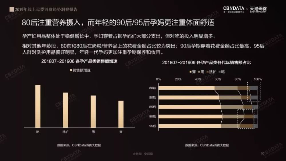這屆母嬰消費(fèi)用戶多數(shù)為90至95后的新生代媽媽,他們的生活方式也總能和科技、創(chuàng)新、便利掛鉤。愛顏有型,自己也樂于做一個(gè)“孩子”,那么這一代人的產(chǎn)品消費(fèi)趨勢是怎么樣的?前兩天,第一財(cái)經(jīng)商業(yè)數(shù)據(jù)中心(CBNData)聯(lián)合天貓母嬰發(fā)布《2019年線上母嬰消費(fèi)趨勢洞察報(bào)告》以線上母嬰消費(fèi)人群為主要研究對象,通過分析他們的消費(fèi)特征,洞察線上母嬰市場的發(fā)展現(xiàn)狀及未來消費(fèi)趨勢。